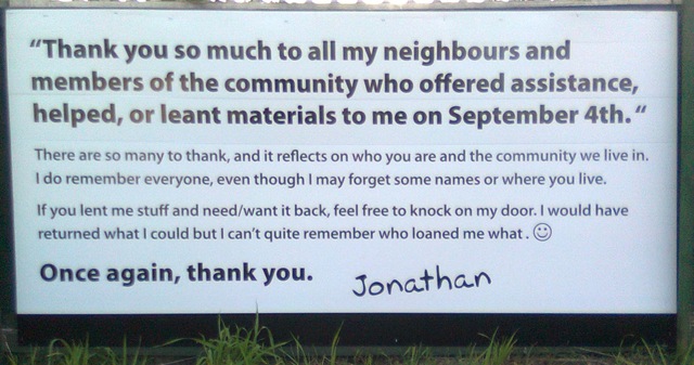 A resident of Avalon St in the Christchurch suburb of Richmond was so overwhelmed with neighbourhood support after the quake that he mounted this sign on his fence.
